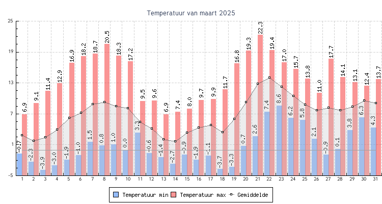 - Hoogste maximumtemperatuur deze maand : 22.3 °C de 21e om 15:20