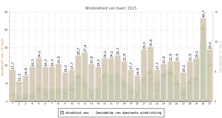 - Maximale windstoot : 46.7 km/h de 30e om 18:45